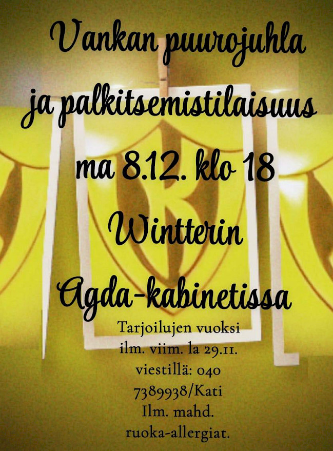 - 2 t sitten Vankan puurojuhla ja palkitsemistilaisuus ma 8.12. klo 18 Wintterin Agda-kabinetissa. Tarjoilujen vuoksi ilmoittautumiset la 29.11. mennessä Katille: 040 7389938. Ilmoitathan myös mahdolliset allergiat.